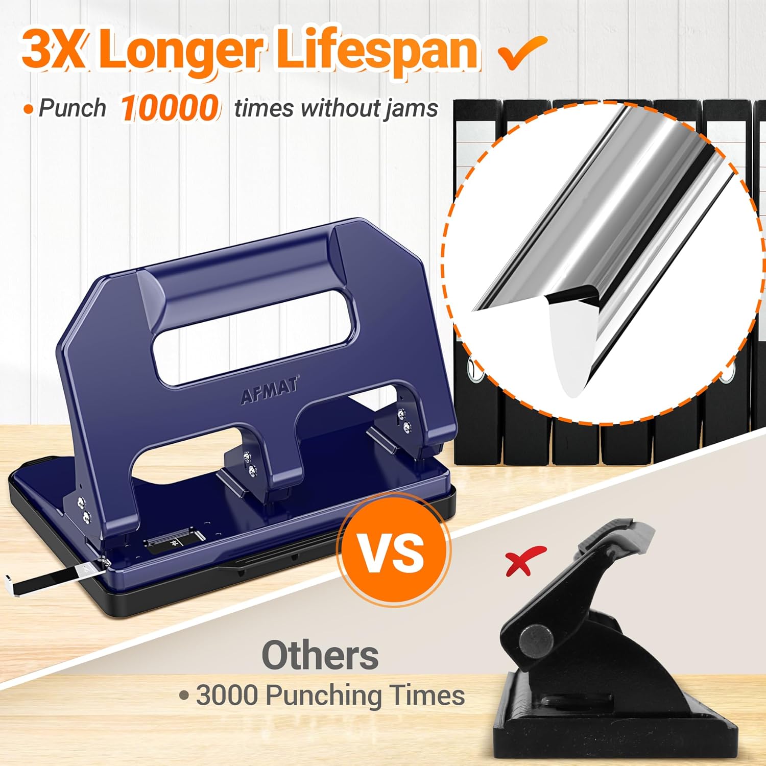 3 Hole Punch Heavy Duty, AFMAT 3 Hole Puncher for Binder, 10000+ Punching Times, 40-Sheet Three Hole Punch, Metal Hole Puncher 3 Ring, 50% Reduced Effort, Bulit-in S.S. Paper Guide, Blue