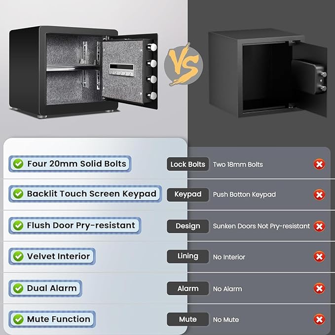• ADVANCED BIOMETRIC RECOGNITION, SMART CONVENIENCE - Here's the scoop on the bio fingerprint upgrade: Kavey home safe now features a top-notch high-resolution biometric sensor that can detect details at 650 DPI and unlock in a speedy 0.1 seconds. Plus, it can store up to 20 different fingerprints, making it a breeze for multiple users to share access. How impressive is that, right?
