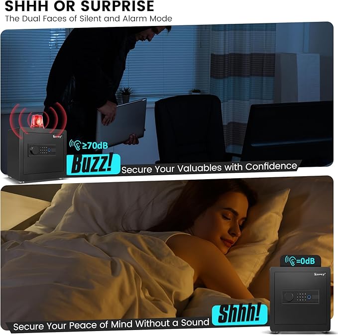 • POWERHOUSE OF SAFETY, DUAL ALARM MASTERY - Hey, safety isn't just a talk—it's a sure thing with the Kavey Home Safe! This money safe is like a security champ with its dual alarm system, ready to take on thieves and those nosy hands. Mess up the password thrice or try to bust in forcefully, and bam! The safe springs into action. And guess what? It belts out a loud 70-decibel alarm that fills the room, scaring off even the bravest intruders. Cool, right?