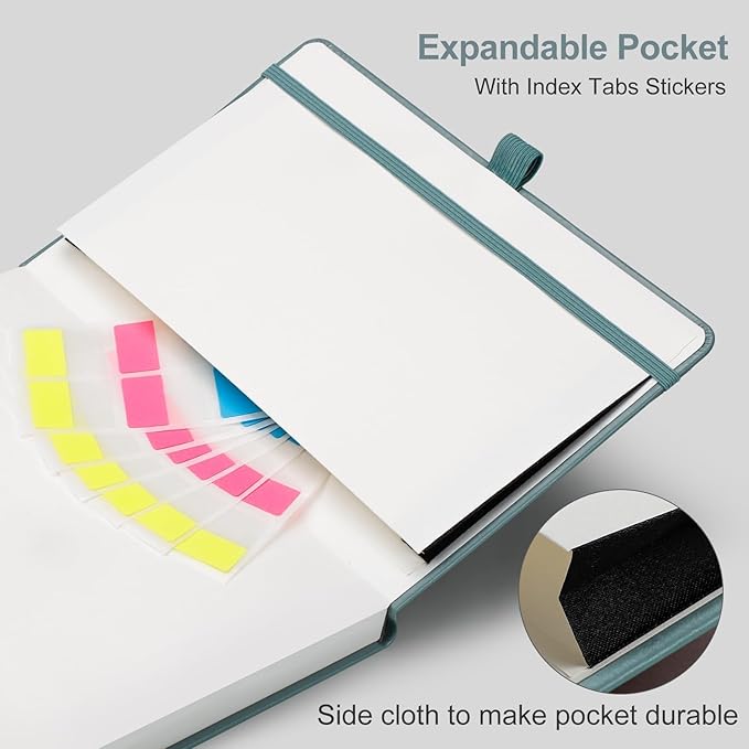 • CONVENIENT AND PRACTICAL LAYOUT: Features a pen holder for easy access to your pen, an elastic band to keep your notebook securely closed, 2 bookmarks for quick page referencing, an inner pocket for storing loose papers, and 18pcs sticky notes for additional organization and reminders