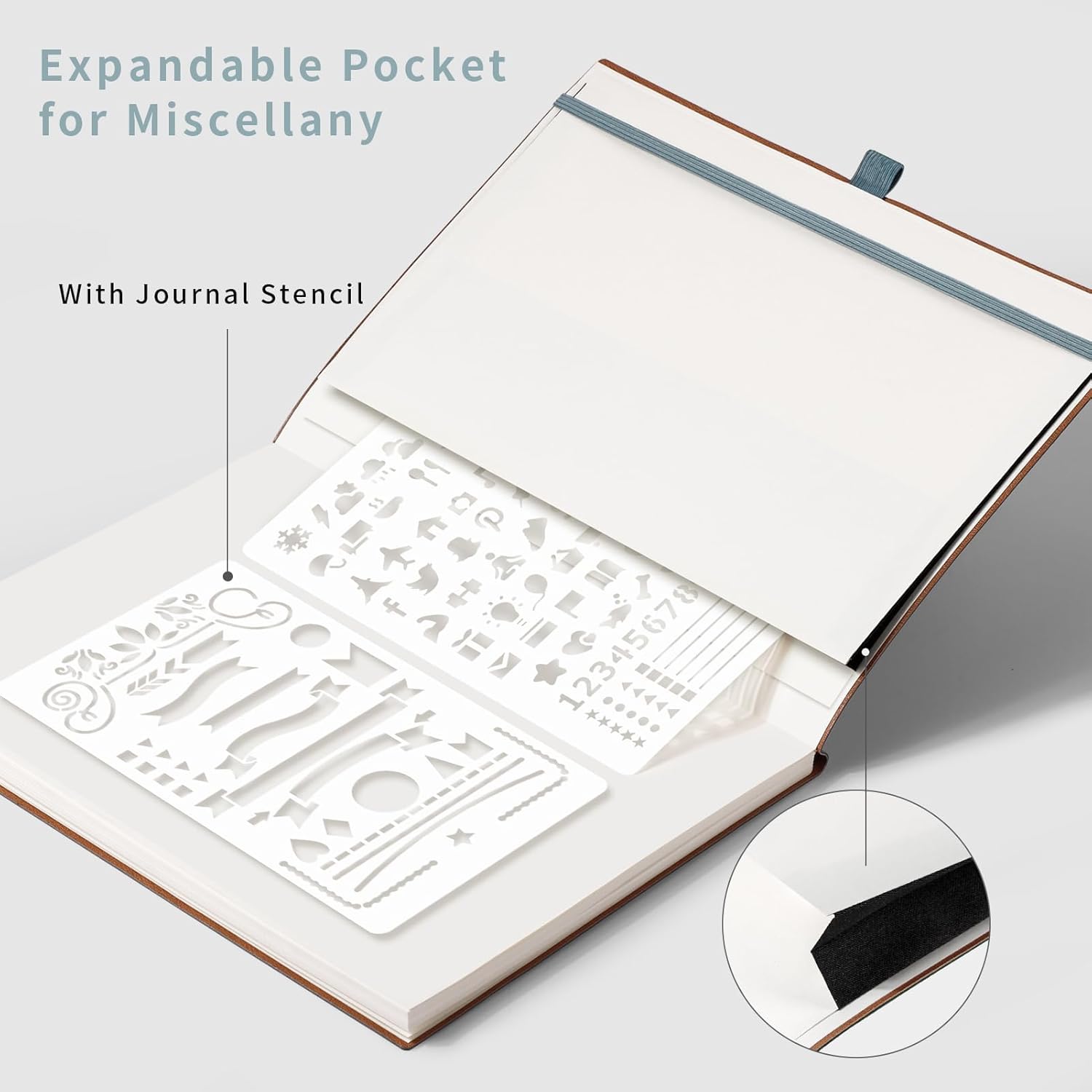 • CONVENIENT AND PRACTICAL LAYOUT: Features a pen holder for easy access to your pen, an elastic band to keep your notebook securely closed, 2 bookmarks for quick page referencing, an inner pocket for storing loose papers, and 2pcs journal stencils for additional creativity