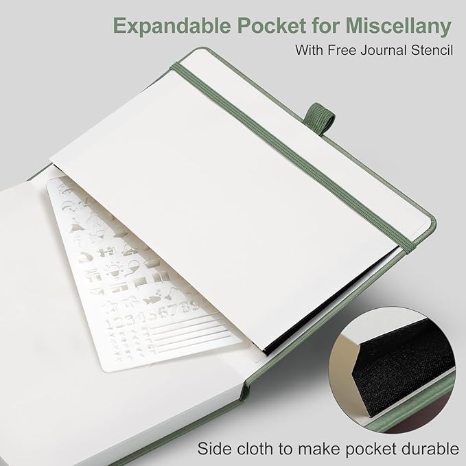 • CONVENIENT AND PRACTICAL LAYOUT: Features a pen holder for easy access to your pen, an elastic band to keep your notebook securely closed, 2 bookmarks for quick page referencing, an inner pocket for storing loose papers, and 2pcs journal stencils for additional creativity