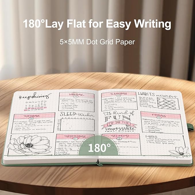 • BULLET DOTTED JOURNAL: This dot grid notebook features 64 sheets/128 pages, providing ample space for writing. The A5 size 5.7" × 8.3" makes it easy to carry. Crafted with a durable and waterproof vegan leather hardcover, it ensures your journal stay protected in any environment
