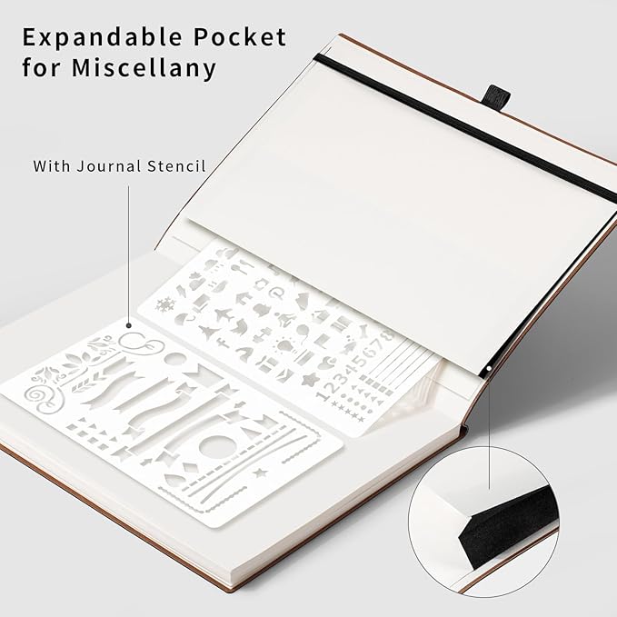 • CONVENIENT AND PRACTICAL LAYOUT: Features a pen holder for easy access to your pen, an elastic band to keep your notebook securely closed, 2 bookmarks for quick page referencing, an inner pocket for storing loose papers, and 2pcs journal stencils for additional creativity