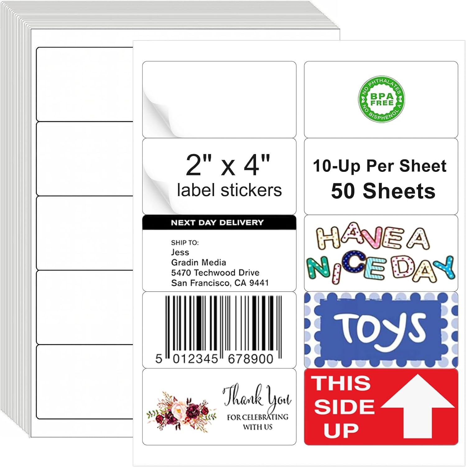 • Label Stickers: The size of each label printer sticker is 2x4 inches, stikcer paper size: 8.5 x 11 inches (US letter size), 10 up small label Per sheet, 50 sheets (500 matte printable sticker labels). The 2 x 4 address label is suitable for most standard mailing and shipping requirements. And the label stickers supports color printing and handwriting, and is also very suitable as a mailing labels for envelopes, address labels, barcode labels, product label and sticker making