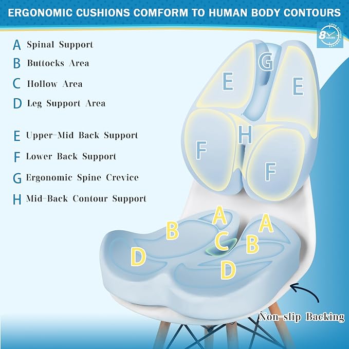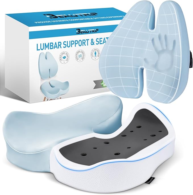 • 🏅【Versatile & Portable】Our Seat Cushion & Lumbar Pillow Combo is ideal for long office hours, helps reducing fatigue and enhance work efficiency. The chair pillows are also suitable for traveling by car or airplane, playing video games at home, or fixing to a wheelchair for a more comfortable sitting experience. Our cushions are essential for anyone seeking extra support and padding in their chair. An ideal birthday or holiday gift for friends, workmates, parents, grandparent, and teenagers.