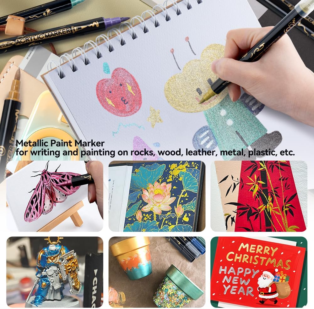• Introducing our new metallic acrylic paint pen set, designed to inspire your creativity and elevate your art projects to the next level! With 12 metallic vibrant colors to choose from, this set is perfect for artists and crafters who want to add a pop of color to their work. These popular and vivid colors will bring your artwork to life and make your ideas stand out.