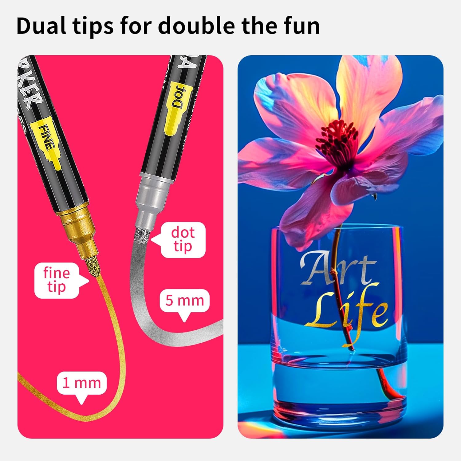 • DUAL TIP: Our rock painting pens come with a 1-5 mm dot tip and a 1 mm fine tip. Designed to give you the flexibility to switch effortlessly between fine lines and bold strokes, these paint pens acrylic markers expand your creative horizons and enhance the intricate details in your work.