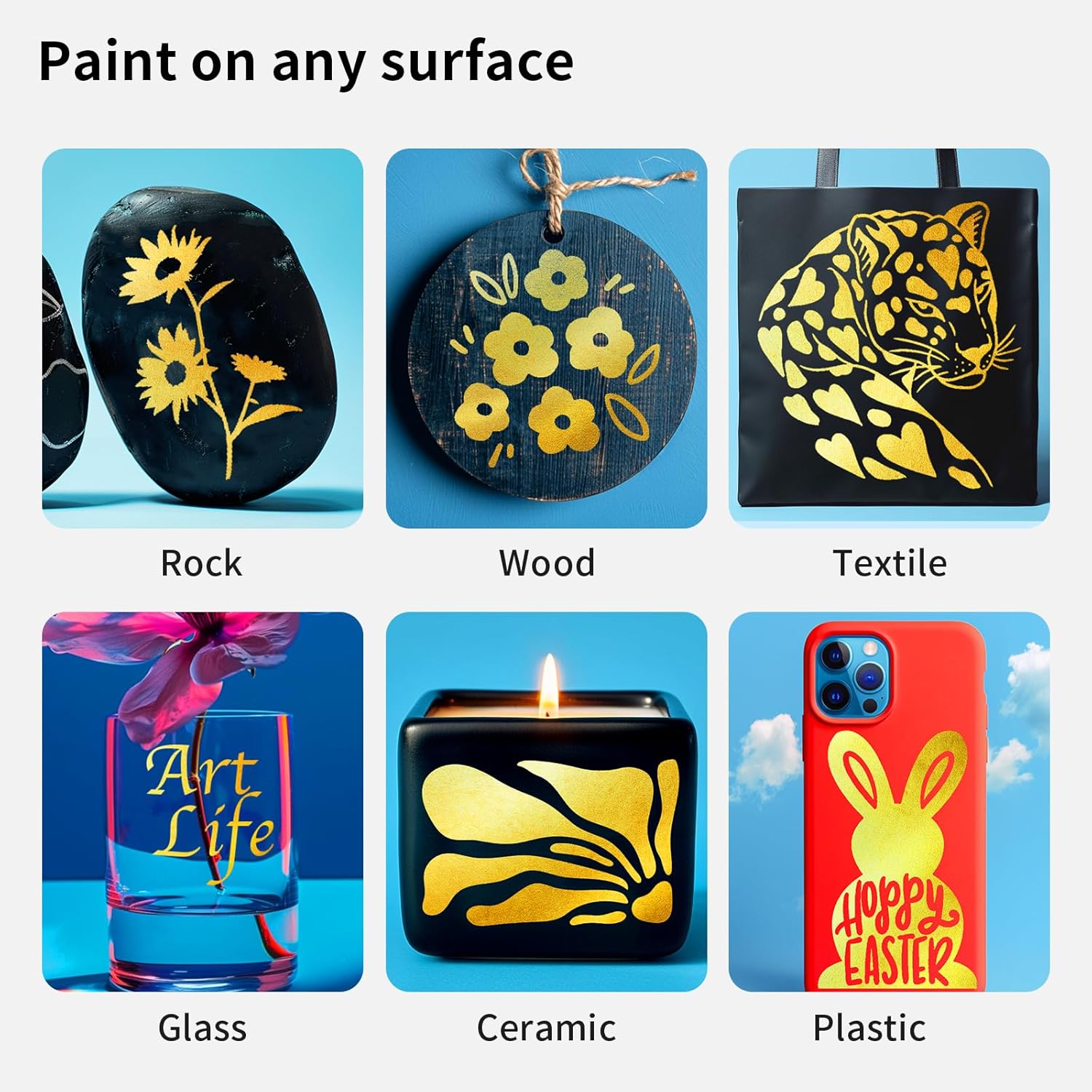 • PREMIUM QUALITY: This gold-pack of paint pens features high-quality acrylic paint and a durable nib that dries opaque, so you don’t have to make a second layer! The gold permanent paint marker is acid-free, waterproof and wear resistant. It’s a great tool for art projects, DIY crafts, coloring, greeting cards, poster making, painting, highlighting.
