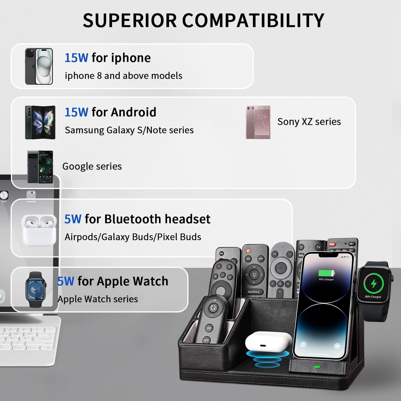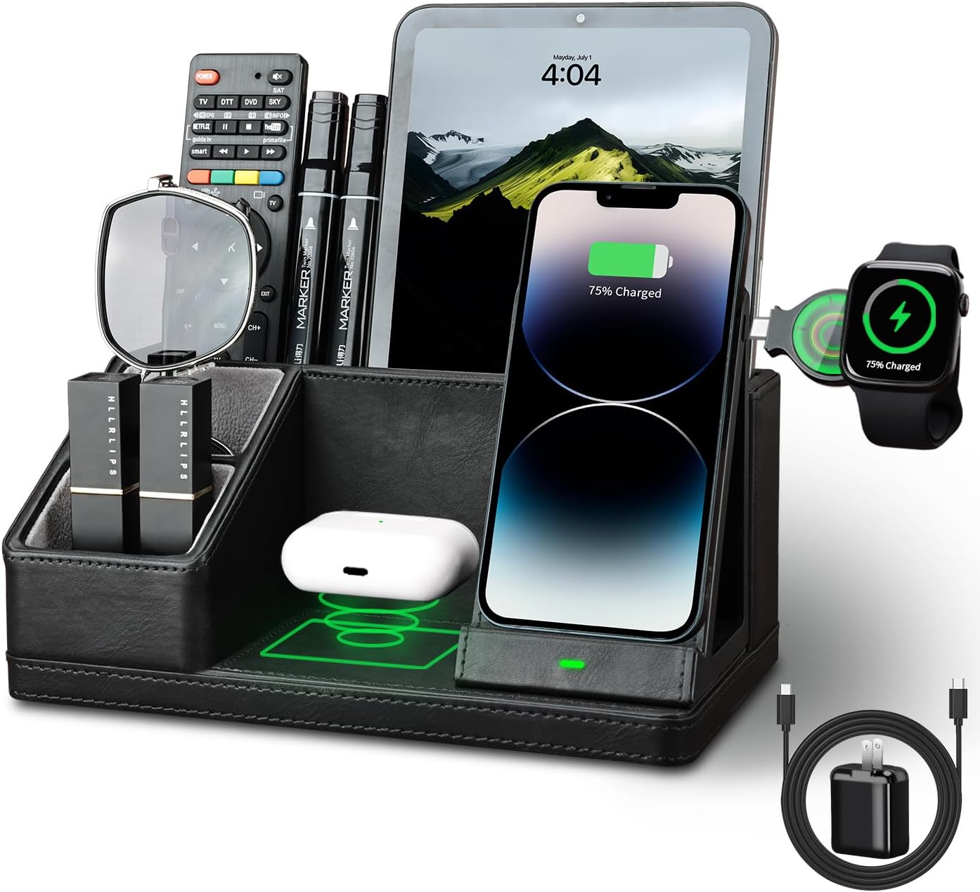 • ▶【Multi-Functional Organizer with Charging Station】: This all-in-one desk organizer with wireless charging station, with dedicated spots made for your iPhone/Apple Watch/AirPods charging at the same time; and keeping your pens, remote control, glasses, and other daily-used small things. Say goodbye to tangled cords and enjoy wireless charging by simply laying your device on the charging stand, no more plug-in/ out troubles.