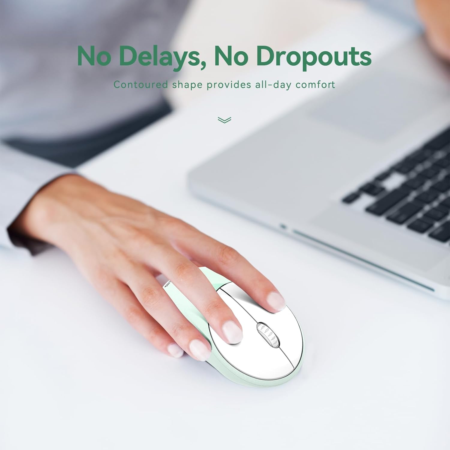 • 【Cute and Lightweight Mouse】 This wireless mouse features a non-slip roller for smooth operation and a unique raised bottom design to reduce friction and wear.The unique raised design on the bottom reduces friction and wear, ensures smooth sliding, provides good support and stability, extends service life, and can perfectly adapt to desktops made of different materials such as leather, wood, cloth, and paper. Additionally, the silent click design prevents disturbance to those around you