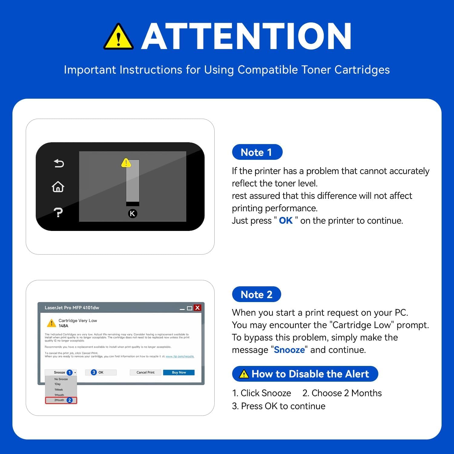 • 📢Important Note: Please must close the HP Genuine Mode before you install compatible toner cartridge with chip, the step is Setup >Supply Settings >Cartridge Supply>off. In order to avoid firmware update to block the compatible toner cartridge to be used continuously in the future, please also close the Printer Update and Firmware Update in Setup.