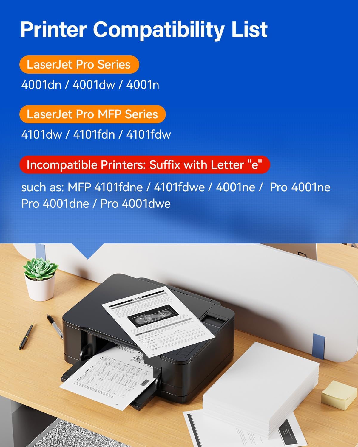 • Compatible with HP LaserJet Pro 4001dn,4001dw,4001n; MFP 4101dw,4101fdn,4101fdw Printer