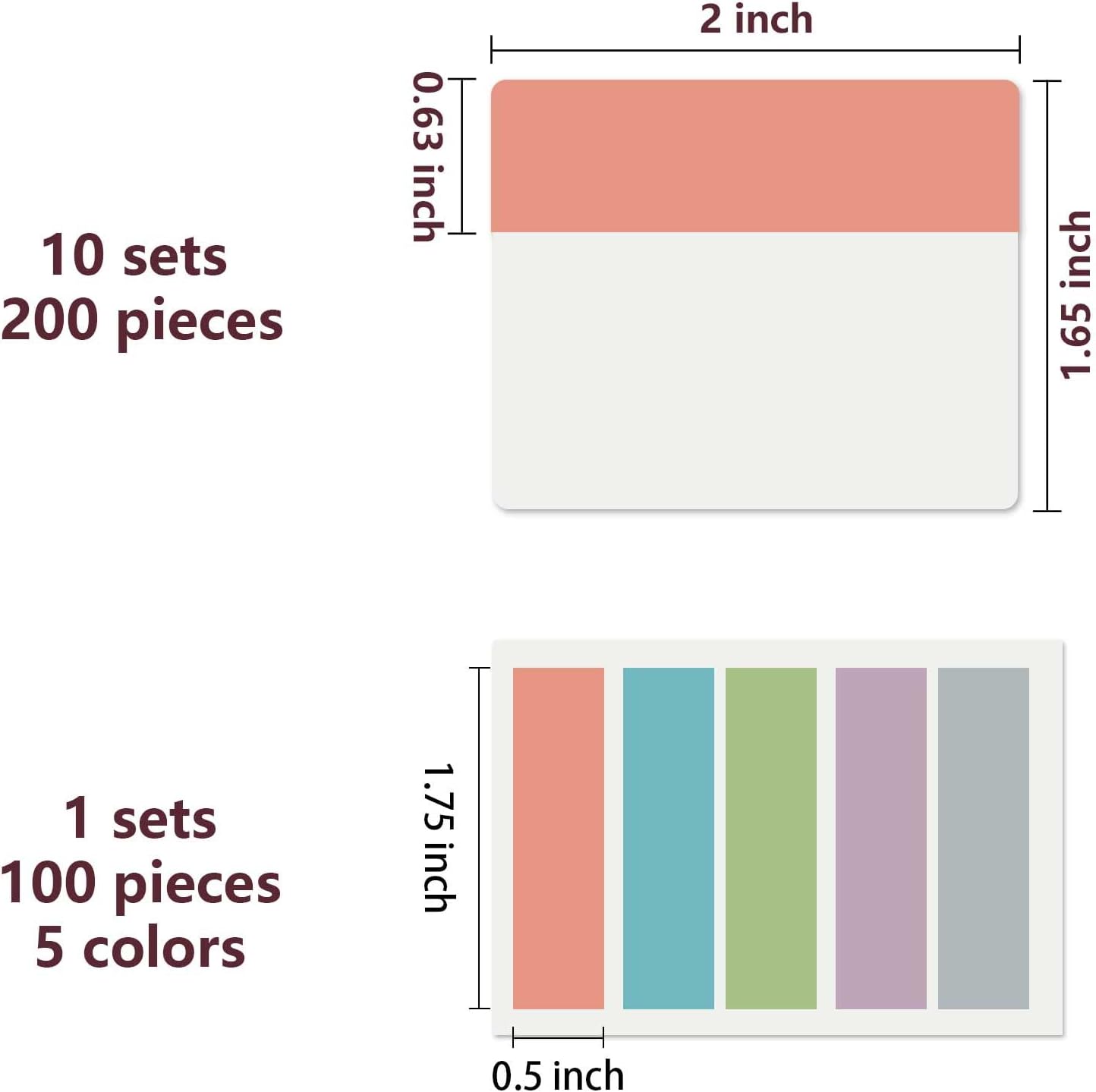 • 300pcs Book Tabs: 300 pcs 21 sets in total, 200 pieces 2 inch sticky tabs in 10 sets with different pastle colors,100 pieces 0.5 in tabs in 1sets, 20 pieces each color