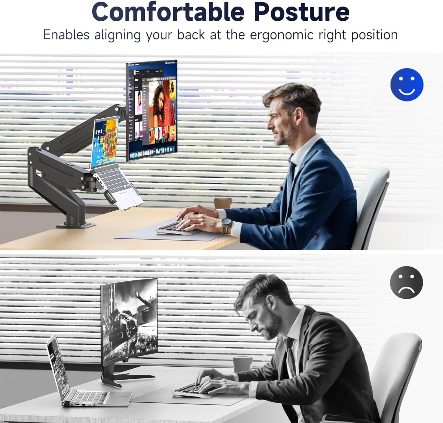 • Space Saving: The 2 in 1 function laptop mount for desk has internal cable management pass-through features to organize wires and cables.This monitor arm mount allow using laptop and monitor at the same time without switching screens. You can also use two monitors at the same time.