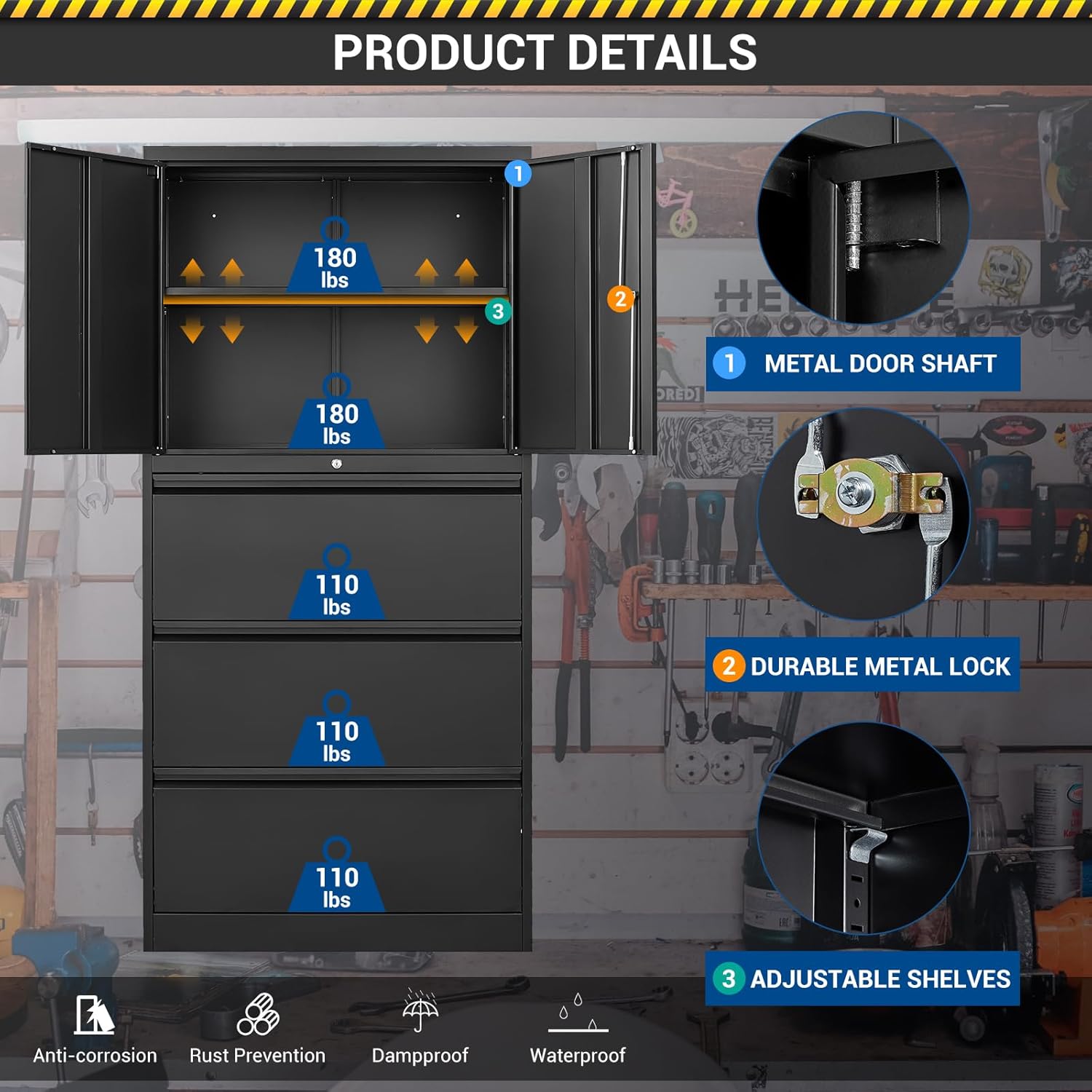 • MULTI-FUNCTIONAL AND DURABLE - The whole cabinet is all made of metal, and the metal shelves above the cabinet can bear about 180 pounds of weight; The metal drawer below can hold about 110 pounds.You can put it in different places such as office, living room, garage, warehouse, etc. It can completely meet your needs.