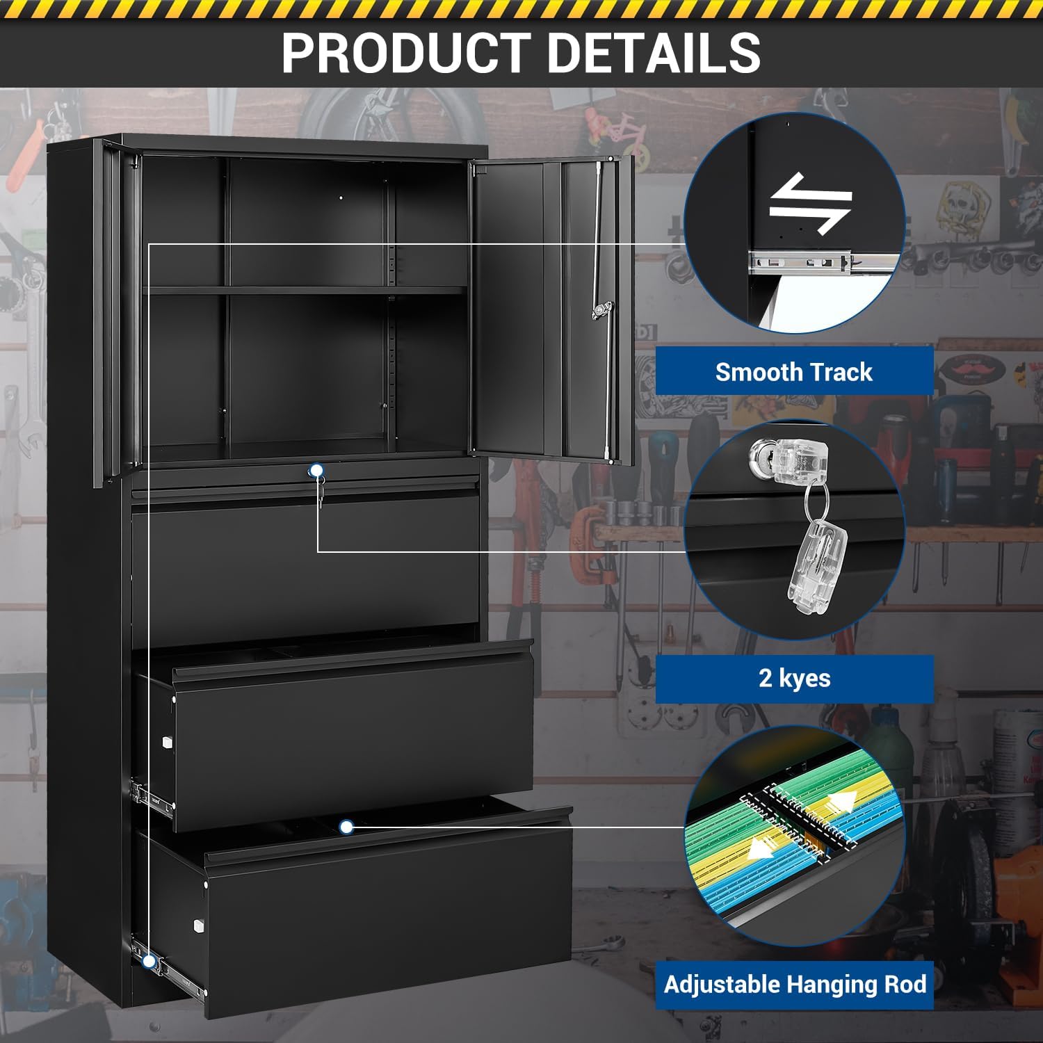 • LARGE STORAGE SPACE - There has a adjustable metal shelves inside the cabinet, which is suitable for storing toolbox, storage box, documents and sundries, etc. The size of the metal drawer is H11.8*W30*D14.8 IN; There has an adjustable metal hanging bar inside the drawer to store Letter/Legal/F4/A4 documents. If you need to store other types of articles or documents, you can remove the metal hanging bar to get more storage space.