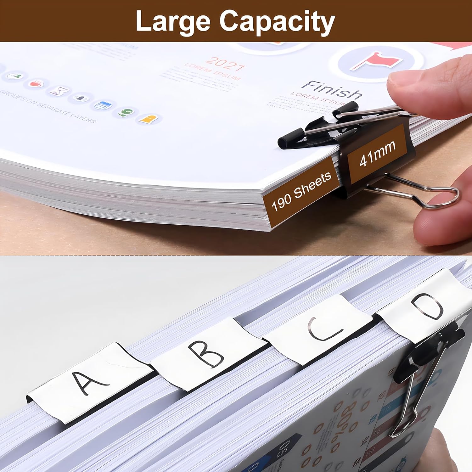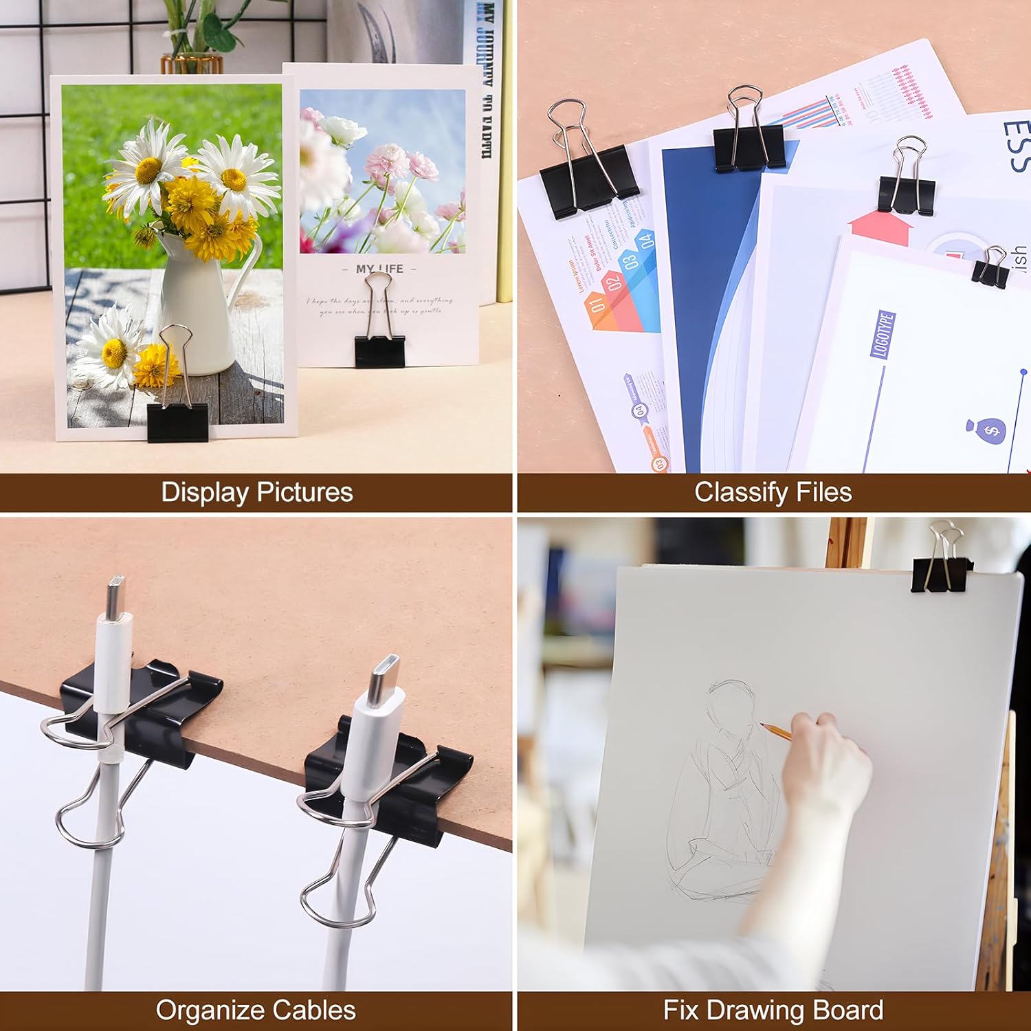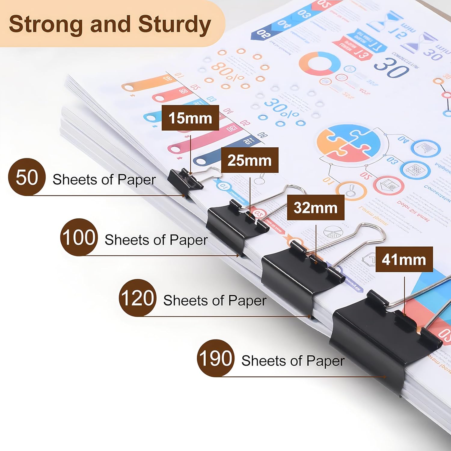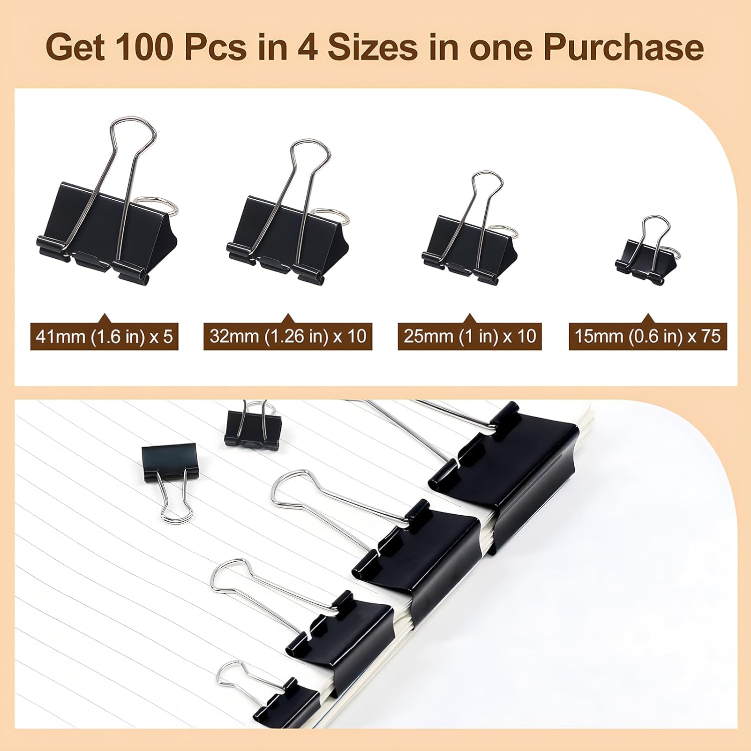• Assorted Sizes: Includes 100 black metal binder clips in 4 sizes - 15mm (mini) x 75 pcs, 25mm (small) x , 32mm (medium), and 41mm (large) - for various paper clipping needs.