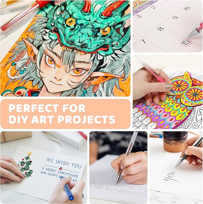• Safe and Variety of Uses :Good quality, non-toxic,very smooth and easy to use.The coloring pens are best for everyone to use in daily life or school work.colorful gel pens are so fun to use for Adult Coloring Books, Scrapbook, Journal, Drawing, Doodling, Coloring, School Projects, Decorations, Home-Made Invitations, Greeting Cards, and so much more.