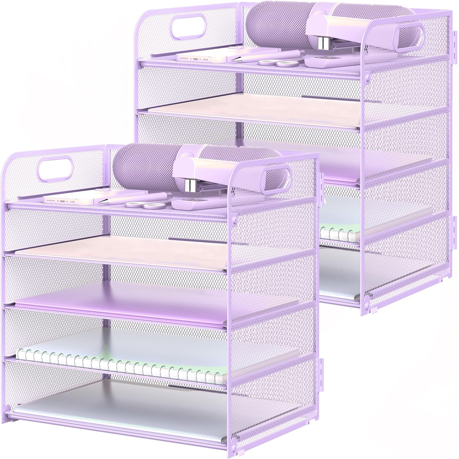 2 Pack Letter Tray Paper Organizer 5-Tier Desk Organizer File Organizer Paper Holder with Handle, Metal Desktop Document Shelf Tray Office Classroom Organization - Purple