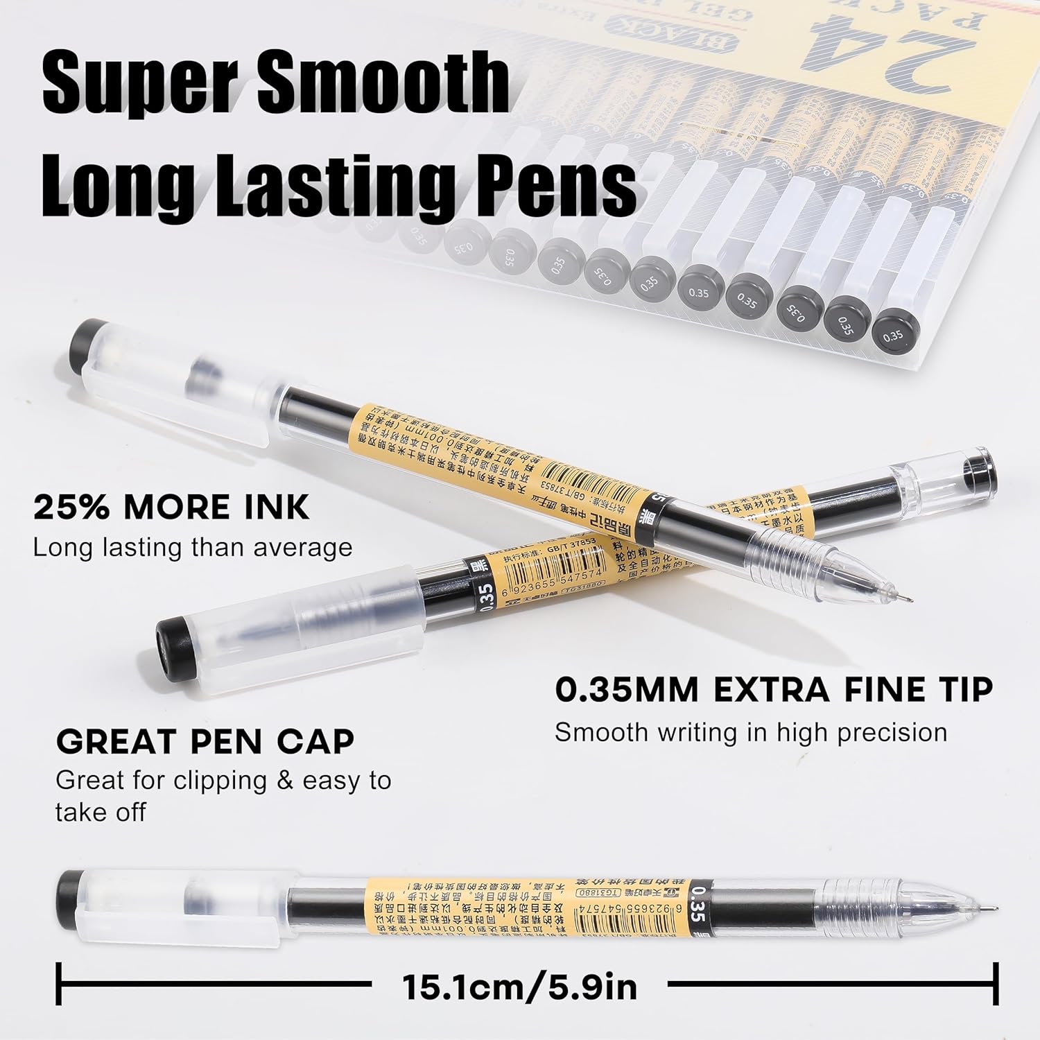• Fine Writing Experience:This set of 24 bulk(15 black+5 blue+4 red), 0.35 mm thin lined gel pens with ultra fine point pen offers smooth writing, similar to premium rollerball pens. Ideal for bullet journaling, art projects, and office/school note taking, great for calligraphy lovers and journaling enthusiasts, ensuring neat lines.