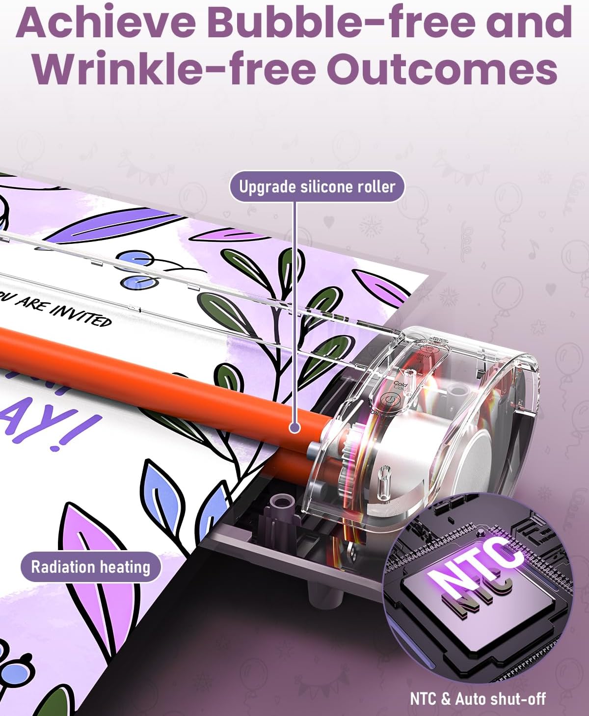 • Create Smooth Projects: This personal laminator for teachers uses NTC real-time temperature control to ensure uniform heating of the rollers, which can effectively avoid the problem of uneven heating leading to blurred and unclear finished products. Your important projects will have a smooth, vibrant, and durable finish. Additionally, this personal laminator features an auto shut-off function, turning off after 45 minutes of inactivity to save energy and prolong its lifespan
