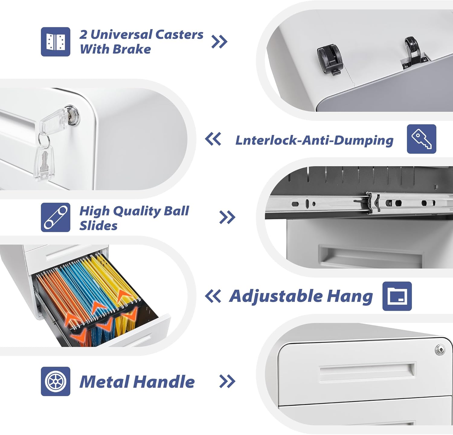• 【Ample Storage Space - Meet Your Needs】: The white locking file cabinet with adjustable hanging rods can accommodate letter, A4, and F4 size hanging file folders, perfect for organizing your files, documents, and other office supplies. Overall dimensions are 17"D x 31.5" W x 27.5" H. Drawer dimensions are 15.7" D x 15" W x 12", providing ample storage space. Additionally, the mobile filing cabinets are designed with sturdy ball-bearing slides, allowing you to effortlessly Open and close drawers.