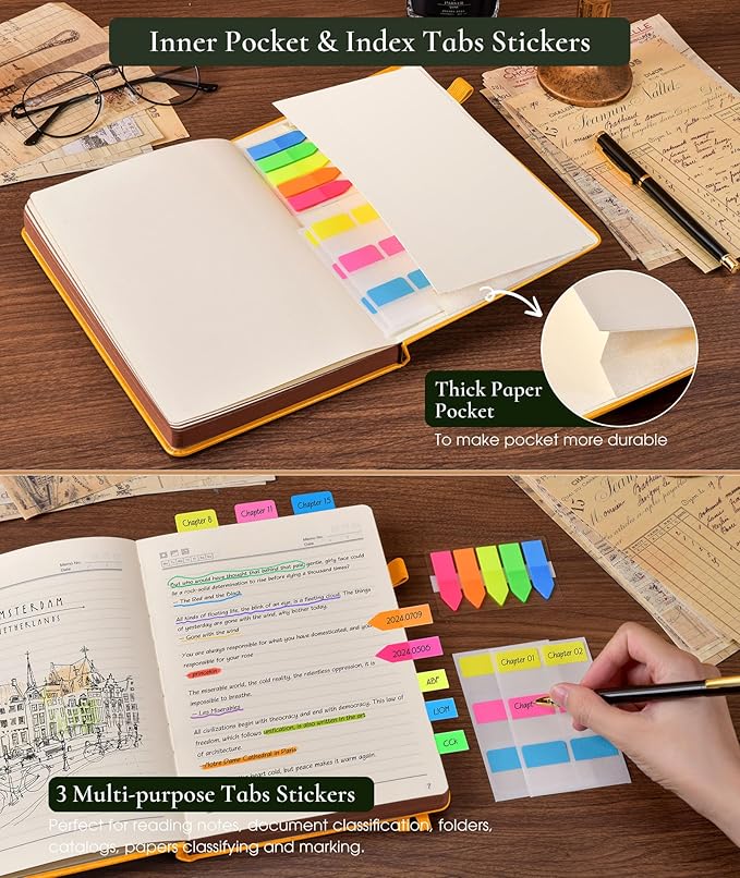 • 【BUILT-IN FEATURES FOR CONVENIENCE】This journal notebook comes with several useful features.The 1 built-in back pocket is ideal for storing loose papers or small items. The 1 elastic pen holder keeps your pen handy at all times.The 2 elastic closures ensure that the notebook stays securely closed.Additionally, the 3 colored ribbon bookmarks help you easily find your place.And the 3 free sticky tabs are great for marking important sections.