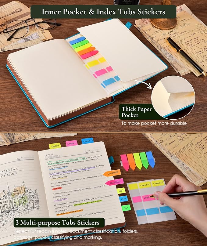 • 【BUILT-IN FEATURES FOR CONVENIENCE】This journal notebook comes with several useful features.The 1 built-in back pocket is ideal for storing loose papers or small items. The 1 elastic pen holder keeps your pen handy at all times.The 2 elastic closures ensure that the notebook stays securely closed.Additionally, the 3 colored ribbon bookmarks help you easily find your place.And the 3 free sticky tabs are great for marking important sections.