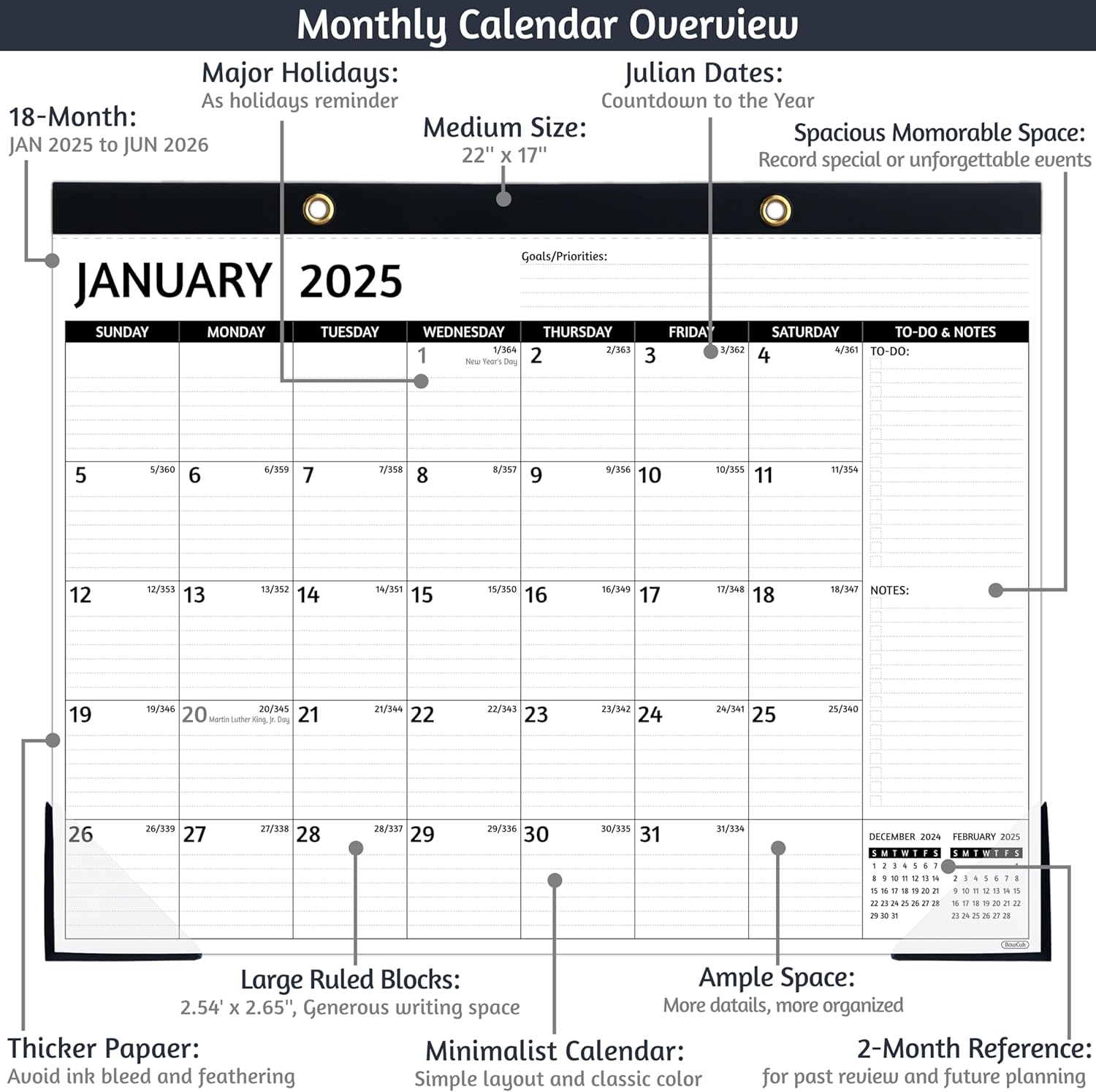 • 🎃 LARGE DESK CALENDAR 2025-2026 – January 2025 – June 2026, this desk calendar large covers 18 months calendar for an easier yearly planning or tracking. Size: 22’’ x 17’’, the large calendar provides spacious writing space for daily scheduling.
