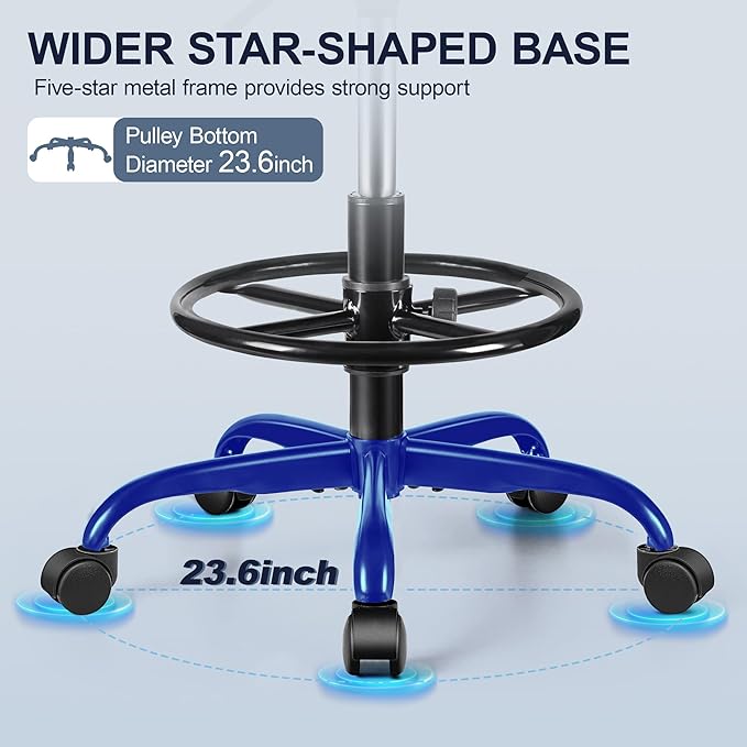 • Adjustable Height and Footrest Ring: The height of the rolling chair can be adjusted from 33.86 inches to 41.75 inches, making it suitable for users of varying heights. The footrest ring of the standing desk chair can be adjusted up and down by 7.87 inches, allowing you to find a comfortable angle for your legs