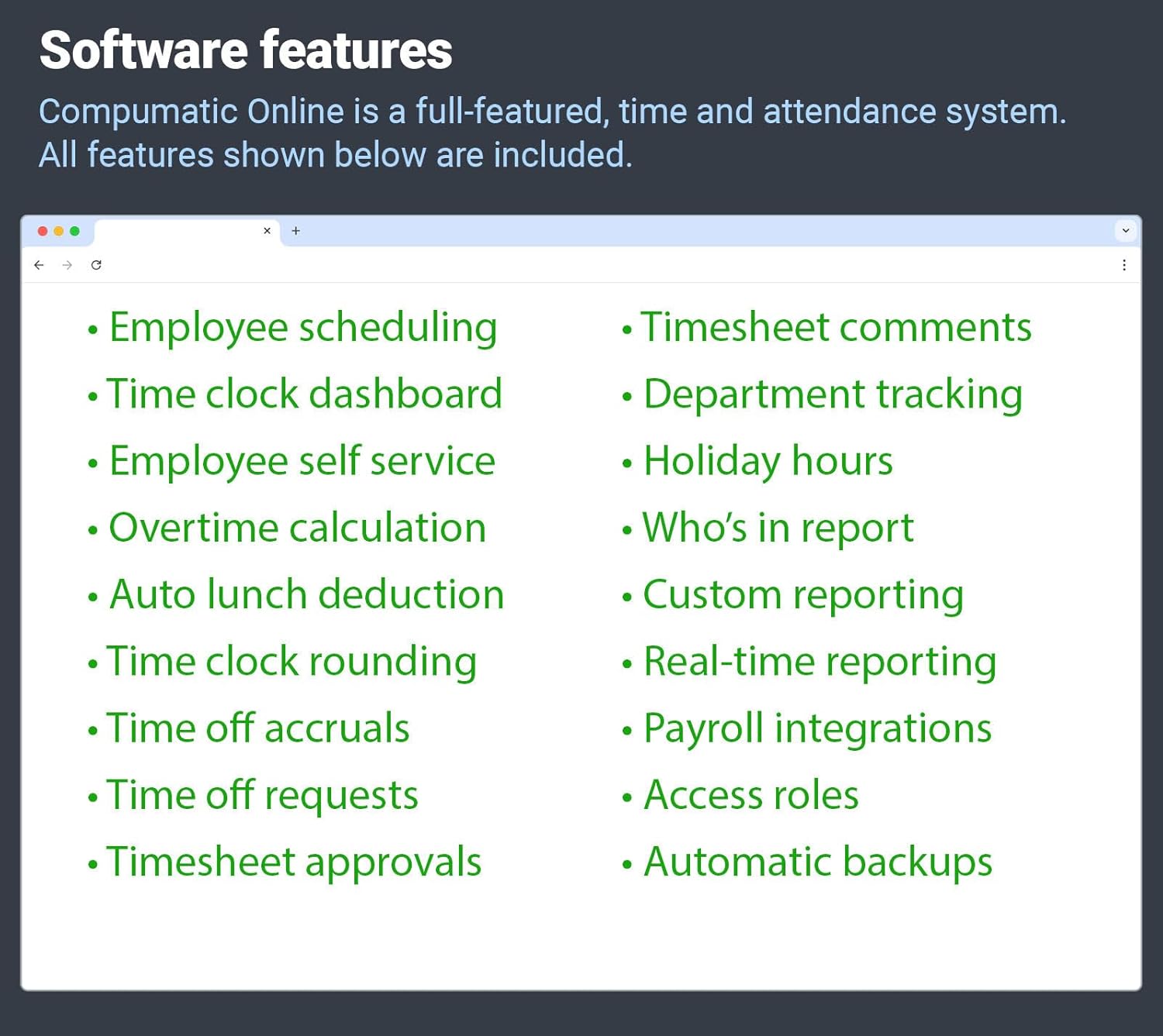 • CLOUD HOSTED WEB BASED SOFTWARE: Powerful features in a user firendly package. Punches are transferred automatically to the cloud in real-time. If you lose the internet, no problem, the clock will store punches until your internet connection is restored. Universal compatibility with Windows and MAC and any standard web browser. No app installation needed, with our intelligent mobile friendly responsive deisgn the website automatically adjusts to the most efficient format for any device (phone, tablet, laptop, or pc). Employees can be provided with a self service login to monitor their own time and request time off. Also allow web punching if desired on a per employee basis.