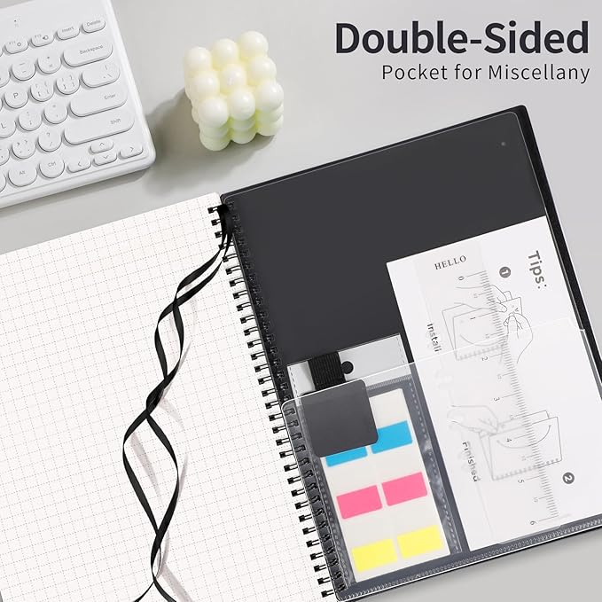 • PRACTICAL LAYOUT: Equipped an elastic band, a self-adhesive pen holder and removable bookmark ruler to keep your notebook organized. Comes with a DIY bookmark with a ribbon for self-attachment to the spiral, serving as a bookmark. Features a double-sided pocket for storing miscellany and 18pcs sticky notes for additional organization and reminders