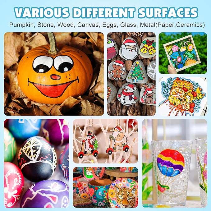 • 【Convenient to Use】Our paint pens with new design.You don't need to shake or press when using it,open the pen cap and you can start your creative journey.our acrylic pens are cotton nibs that it can be used directly.Our acrylic markers conforms to ASTM D-4236.Warm tip:To ensure the smoothness of the ink, please place the pen flat and cover it with a pen cap after use.