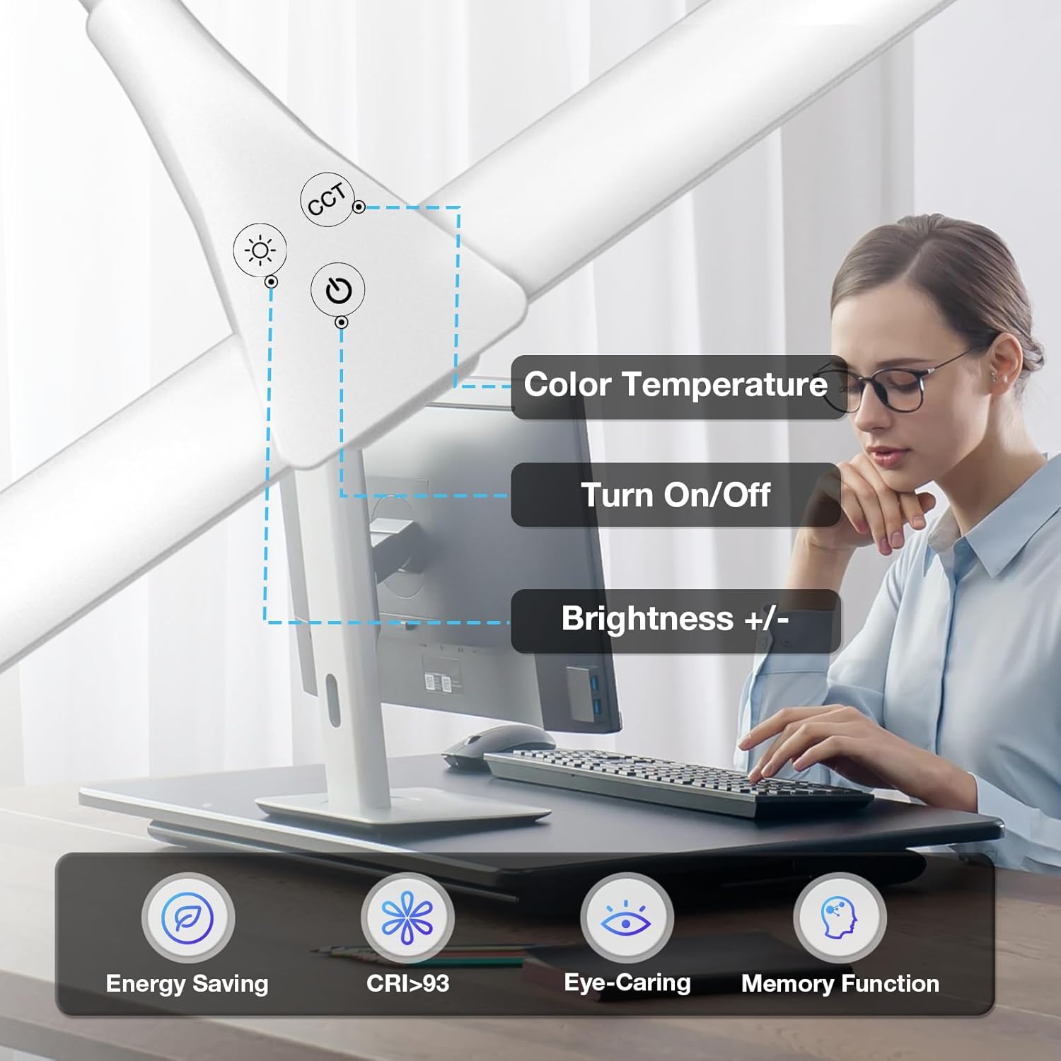 • Eye-Caring&Memory Function: home desk light features comfortable and soft light of CRI>93, 1800lm. No glare, flicker and ghosting, adjustable light settings help you better adapt to the vision. The previous brightness and color mode will be retained as long as being properly turned off via power button
