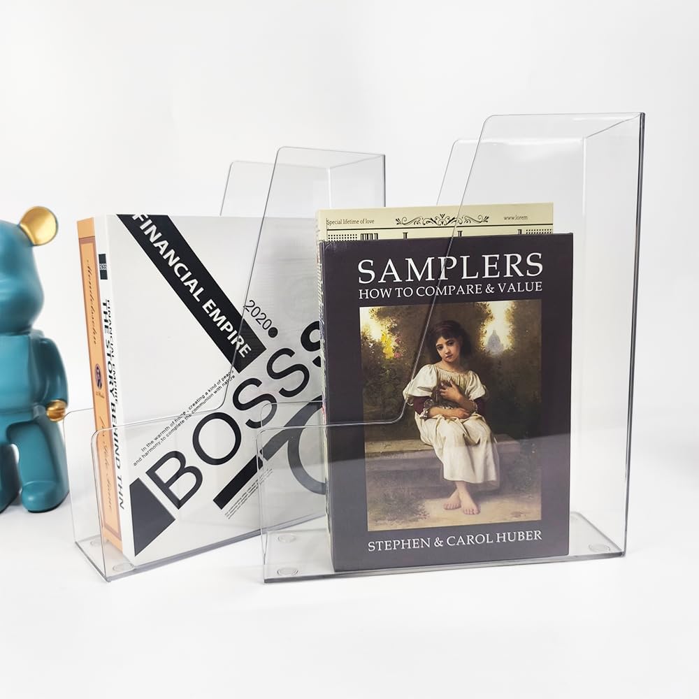 • Versatile Storage: Clear plastic vertical file holder and magazine organizer for home or office use, perfect for storing binders, notebooks, envelopes, and documents.