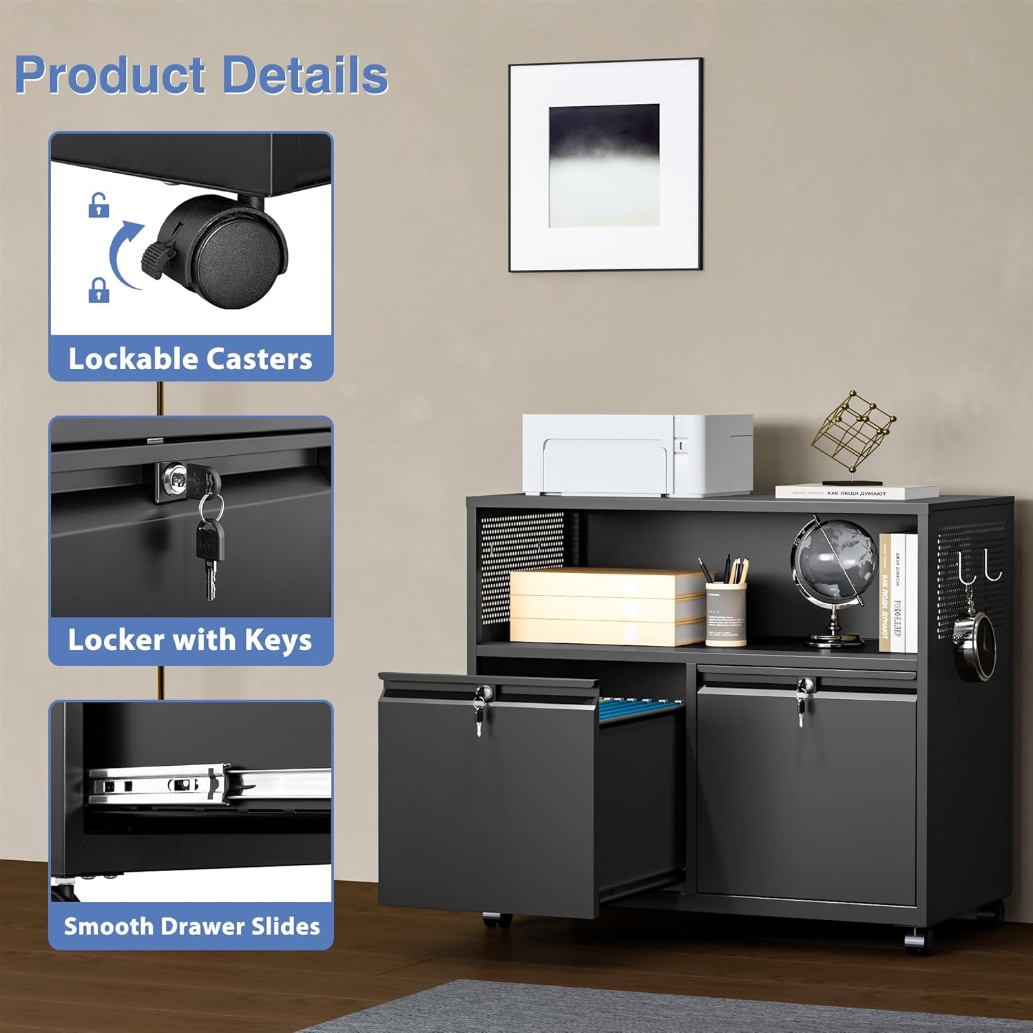 Metal File Cabinet,2 Drawer Filing Cabinet with Lock,Rolling Printer Stand Storage Cabinets with Shelves for Home Office Letter/Legal/A4 Size Files(Black)