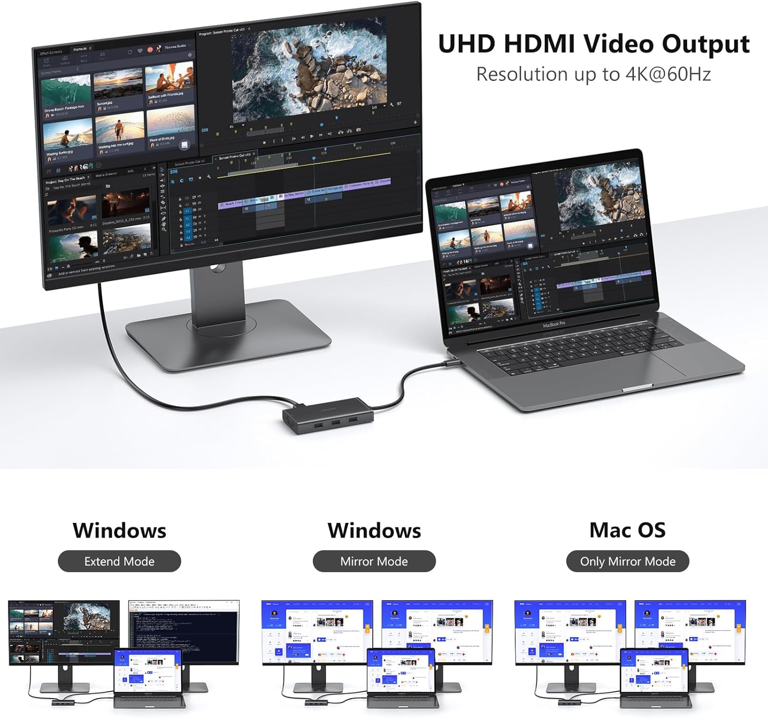 • Dual 4k Resolution Output: HDMI1/DP max up to 4K@60Hz, HDMI2 up to 4K@30Hz(work separately while source is DP1.4). When dual displays, HDMI1 or DP will be 4K@60Hz and HDMI2 up to 4K@59Hz(DP1.4). When using 2 hdmi+DP, HDMI1 up to 4K@59Hz, DP up to 4K@29Hz, HDMI2 up to 2K@60Hz(DP1.4).Display output will be 1080P when multiple monitor with VGA. Note!!! When using daul hdmi+DP, must follow the sequence or it will fail: Plug in HDMI1→Plug in DP(wait for the screen to display successfully)→Plug in HDMI2