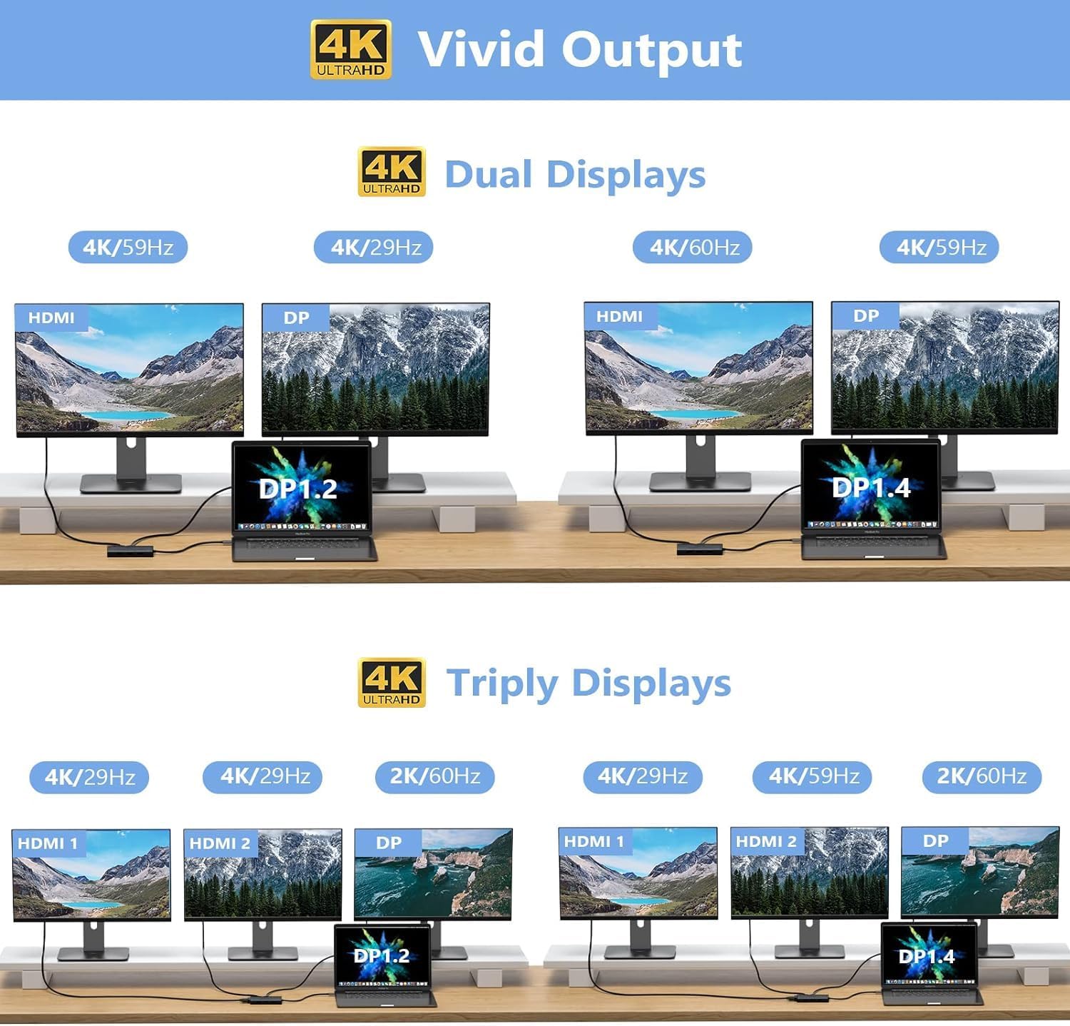 • Docking Station 4K Display Adapter: The Laptop Docking Station with 4 video output ports: 2 HDMI+DP+VGA, can output up to 4K Dual/Triple Display videos; For quadruple display Dual HDMI, DP, and VGA all are 1080@60Hz. Please make sure your laptop specification support DP1.4 signal output. If the VGA port is connected, it will affect the resolution of all displays up to 1080P only
