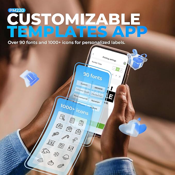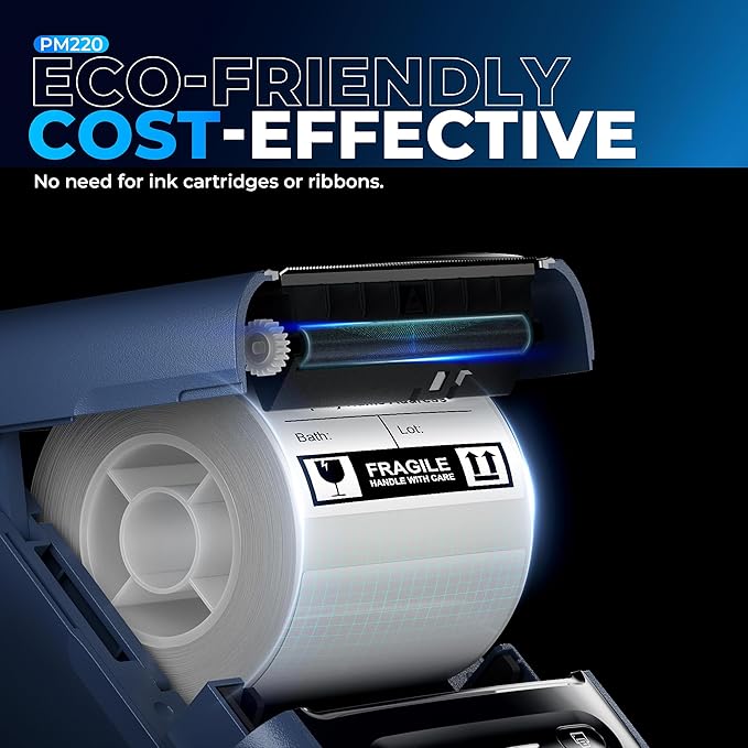 • Powerful APP- The PM220 label maker machine with tape comes with label templates and can set up your own templates. This label printer allows you to customize and format labels, supporting various features such as QR codes, barcode labels, tables, materials, time, figures, text, icons. This label maker machine with tape APP included more than 90 +Fonts, 14+ Languages, 450+ Materials. Please do not tear or destruct the green sticker on the back of the label strip, otherwise it will affect the printing effect
