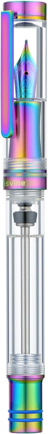 Asvine V200 Titanium Fountain Pen Vacuum Filling, Rainbow Bock Extra Fine Nib Clear Demonstrator Acrylic with Pen Case and Wrench