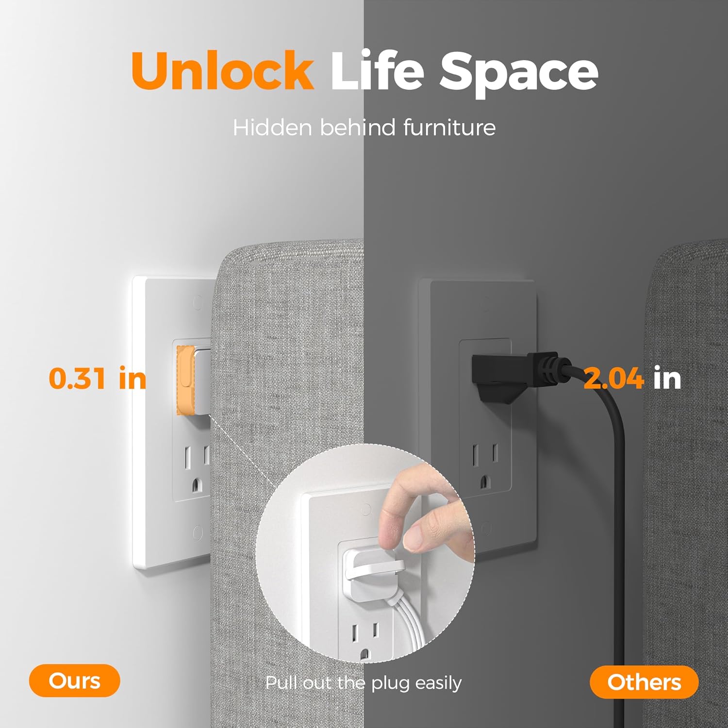 • Easily Pull Out Flat Plug: TESSAN 0.31 inches ultra thin flat head includes a built in pull ring for easy unplugging in tight spaces like behind TV or sofa; The design make this flat plug power strip inserted or removed effortless and safe