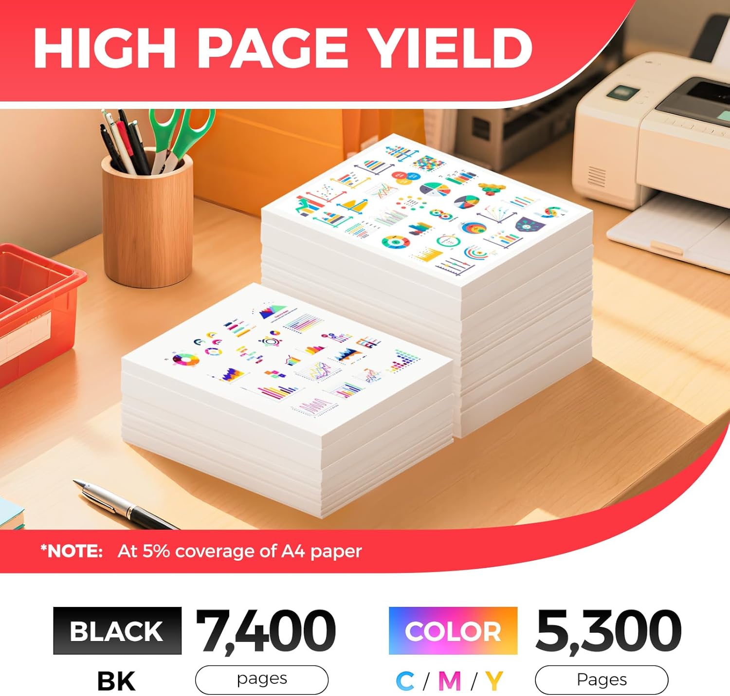 • High-Yield: up to 7,400‬ pages per T12 Black and 5,300 pages per T12 Color (Total 23,300 pages, 5% coverage).