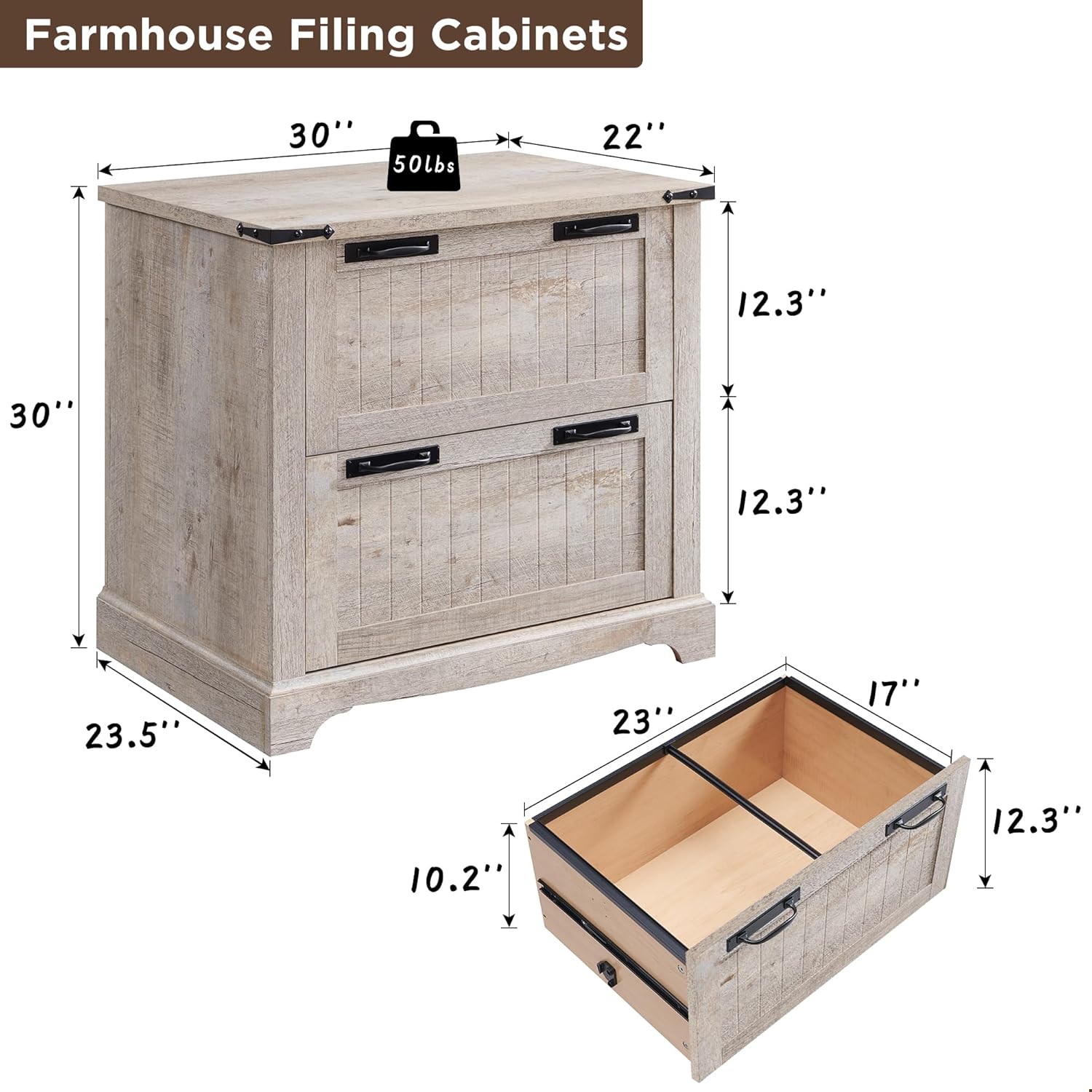 • Sturdy Construction: The filing cabinets are produced from high-quality engineered wood and are built to endure daily application and provide lasting storage. Designed with the customer in the forefront of the mind, this 2-drawer farmhouse file cabinet combines functionality and aesthetics. Tabletop can hold up to 50lbs.