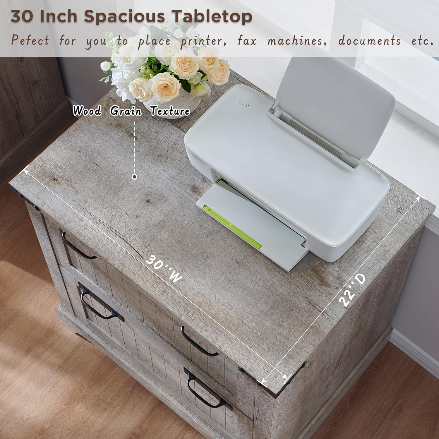 • 30 Inch Spacious Desktop:This office filing cabinet is a powerful assistant for your efficient work. 30 inches spacious desktop has a rustic finish with a delicate touch, being stain-resistant and easy to clean. No matter if you use it intensively for a long time or accidentally cause bumps or water spills, it will always remain aesthetically pleasing and practical.