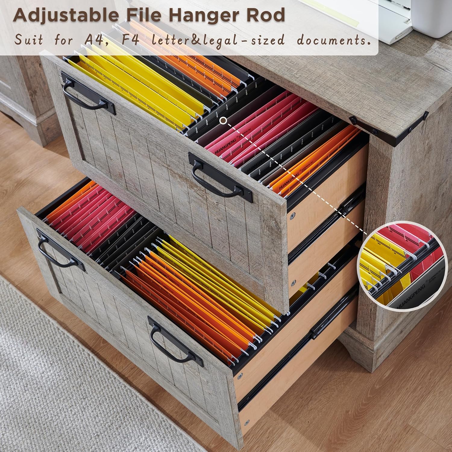 • Large Capacity Storage: Feature with 2 large drawers and possesses a vast interior space, which can effortlessly accommodate a large number of files, folders, and various office supplies. The file hanger rod design and reasonable zoning facilitate the classified storage of different types of files and improve the storage efficiency.