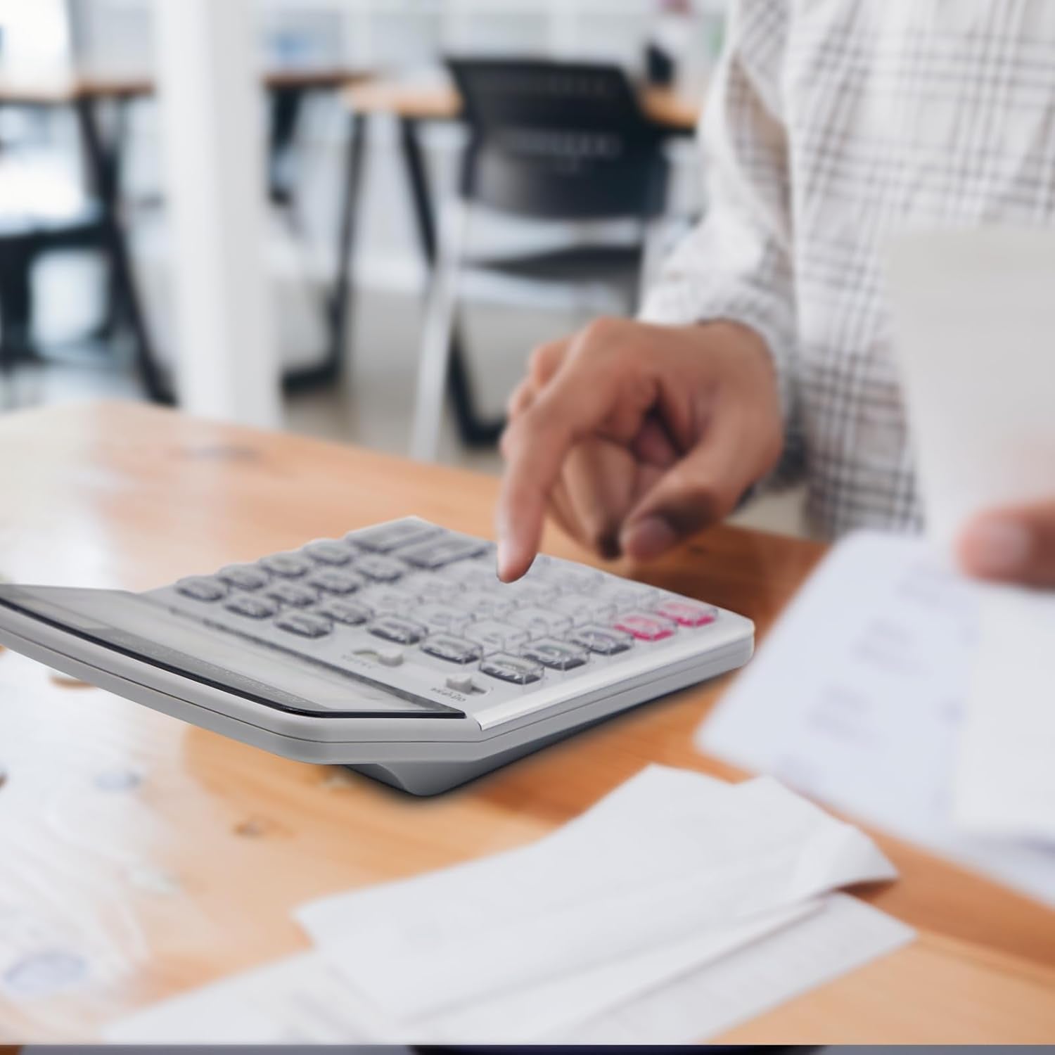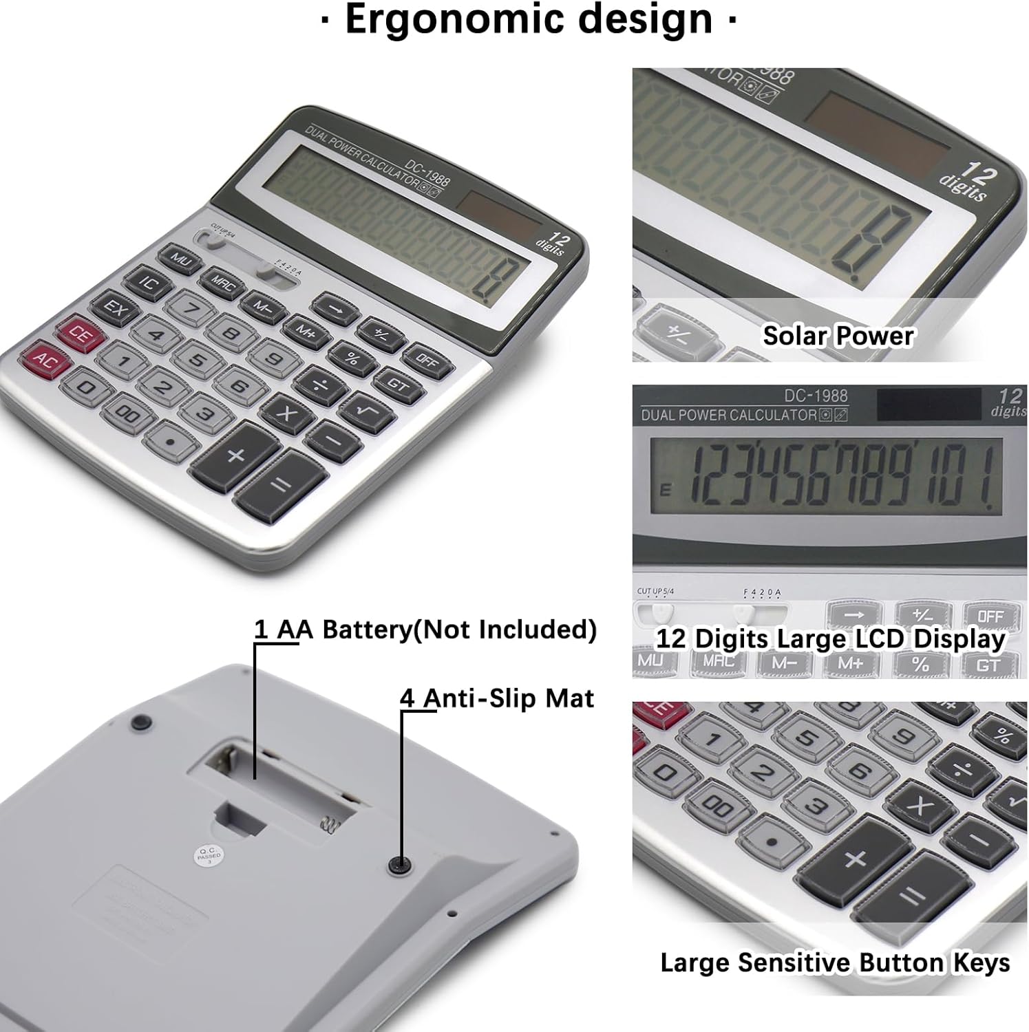 • 【Large LCD Display】The office calculator is equipped with huge LCD screen display clear 12-Digit big numbers.Desktop calculator tilted and angled display allows you to easily see your calculations without straining your eyes