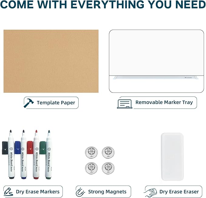 • 【ACCESSORIES INCLUDED】: The package includes 4 dry erase markers, 4 magnets, 1 glass whiteboard eraser and 1 removable aluminium marker tray for mounting. One-stop shopping. It's a great gift idea for your workmate, boss or spouse which can enhance the office/ house atmosphere