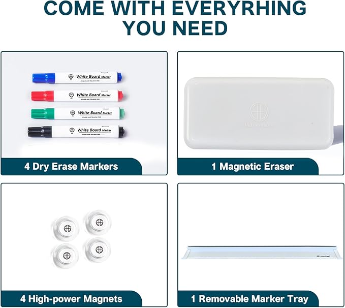 • 【ACCESSORIES INCLUDED】: The package includes 4 dry erase markers, 4 magnets, 1 glass whiteboard eraser and 1 removable aluminium marker tray for mounting. One-stop shopping. It's a great gift idea for your workmate, boss or spouse which can enhance the office/ house atmosphere