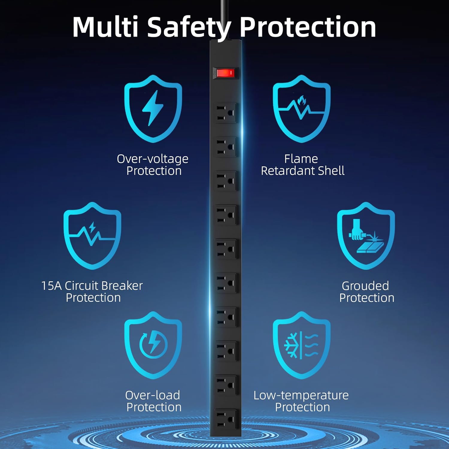 • ✅OVERLOAD PROTECTION:A power switch with lighting has a built-in high quality 15A circuit breaker for overload protection. When the operating current exceeds the rated current, this power strip automatically cuts off the power supply from spikes, fires or other unsafe conditions.